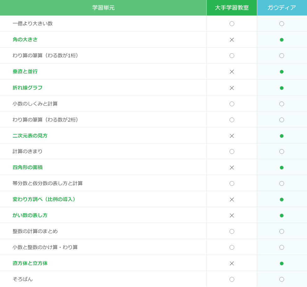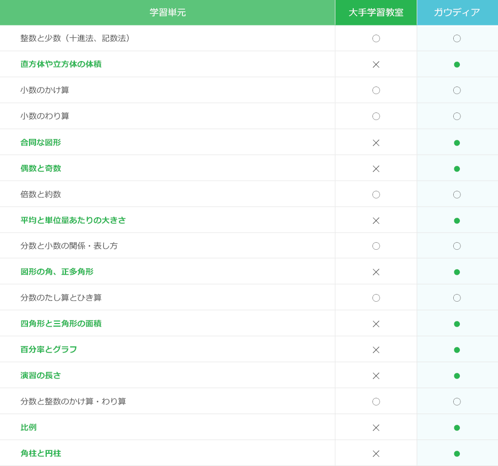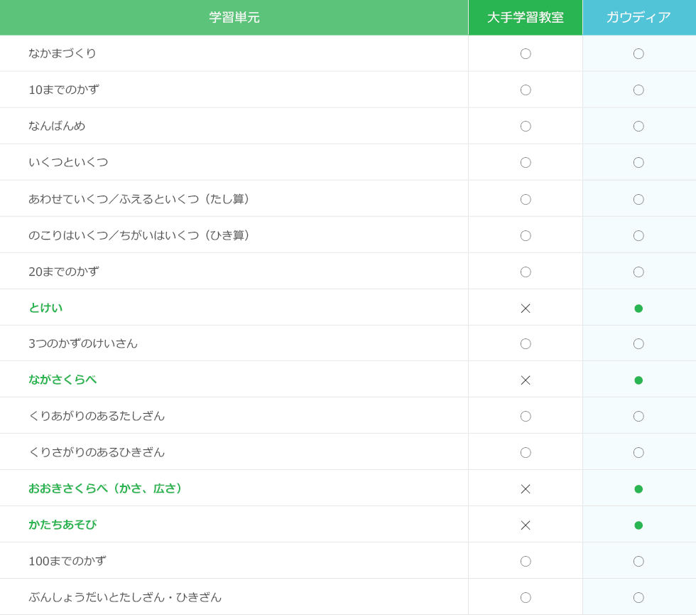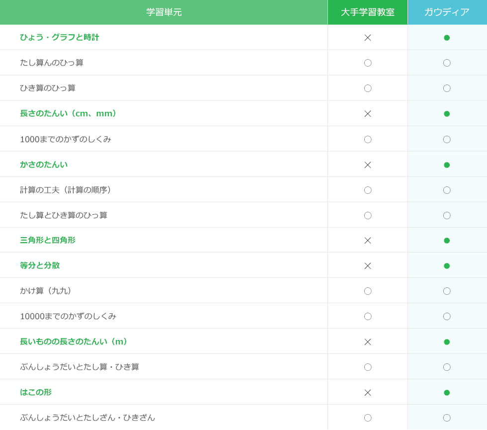 ガウディアの教材は、小学校で習う算数と国語のほぼ全ての単元を学習できます。さらに、すべての子が、自分の力で理解し、自信を持って学習を進めることができるように、お子さまの現在位置に合った学習箇所が必ず見つかるだけのボリュームがあります。
